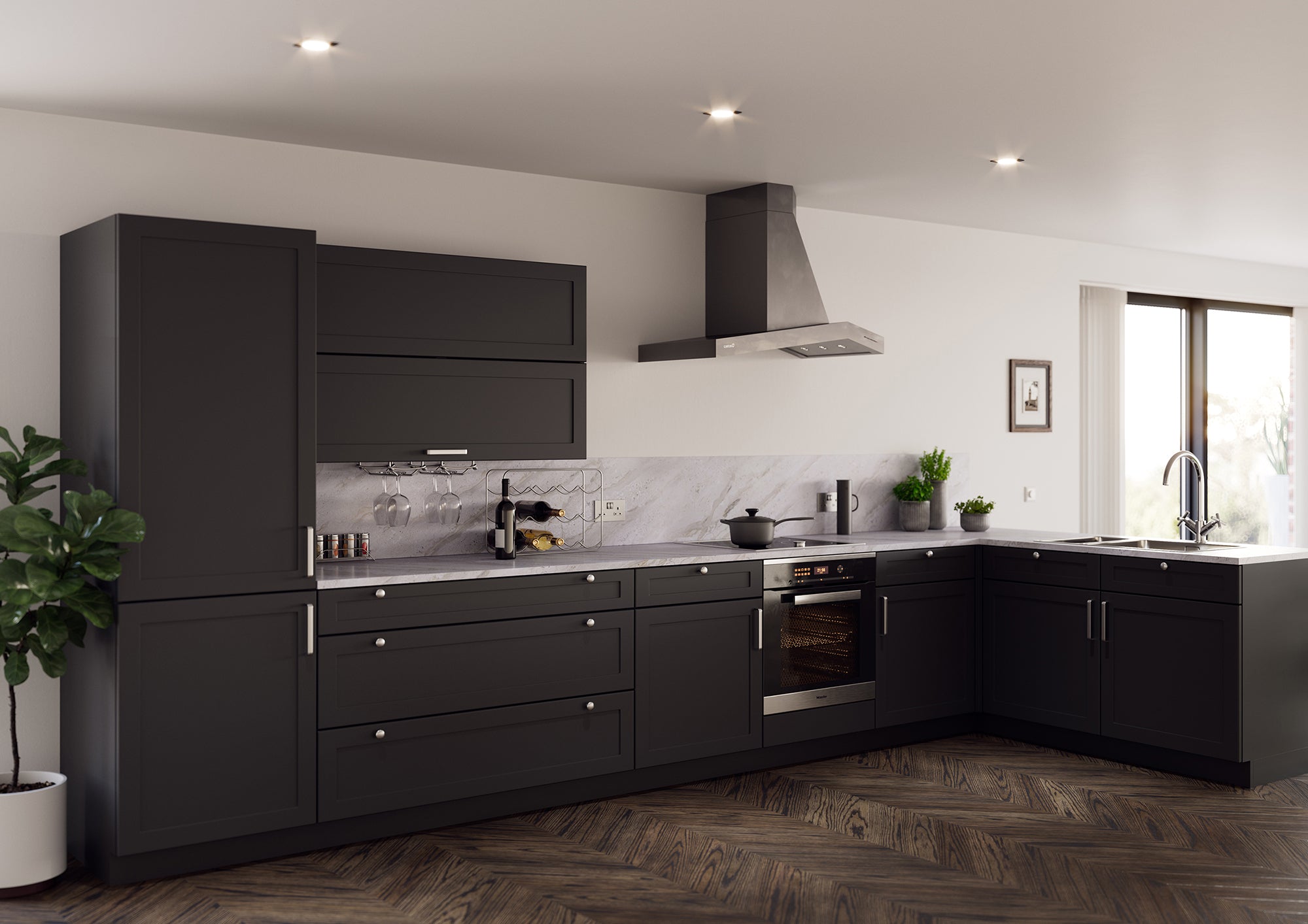 Upgrade your space with the Juan Super Matt Black Modern Shaker Door. Enjoy a quick delivery and a luxurious smooth finish. Elevate your home with this modern and sleek addition.